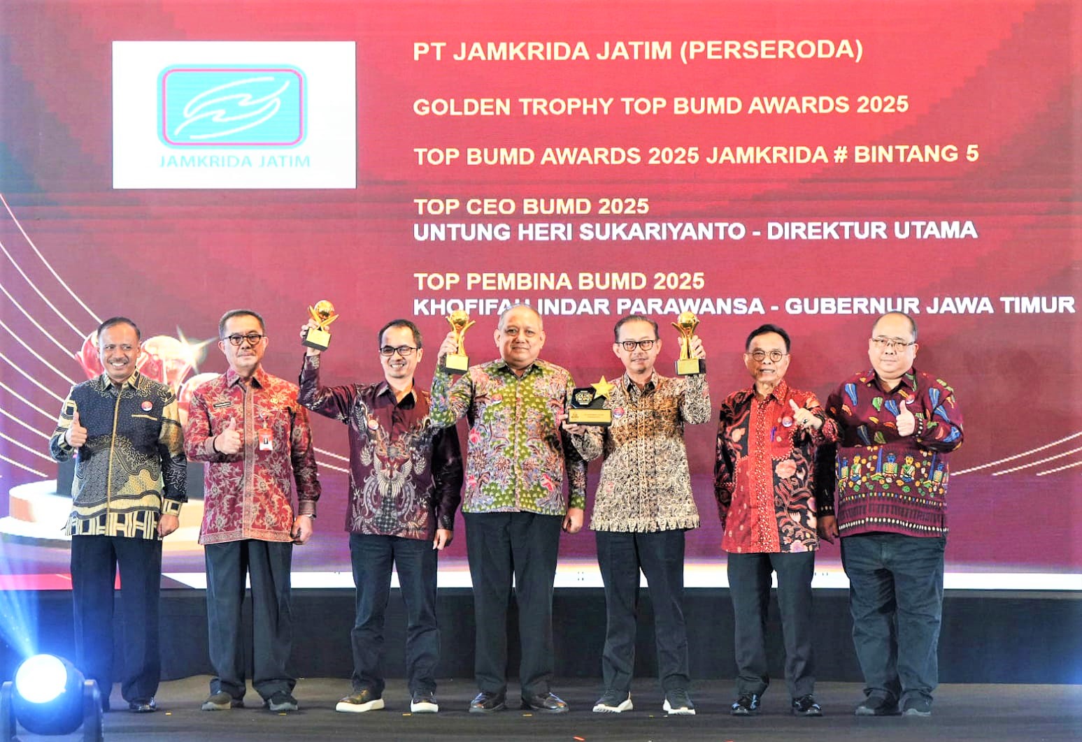 Dihadiri oleh Bapak Untung Heri Sukariyanto selaku Direktur Utama PT Jamkrida Jatim (Perseroda) serta Bapak Abdulloh Badruddin selaku Direktur Keuangan PT Jamkrida Jatim (Perseroda), pada tahun 2025 ini, PT Jamkrida Jatim (Perseroda) mendapat penghargaan Golden Thropy yang mana penghaergaan ini diberikan kepada BUMD peraih penghargan bintang 5 dalam 3 tahun berturut-turut. Dan hadir juga Bapak Ir. Joko Irianto, M.Si selaku Asisten Perekonomian dan Pembangunan yang merupakan perwakilan dari Pemerintah Provinsi Jawa Timur.